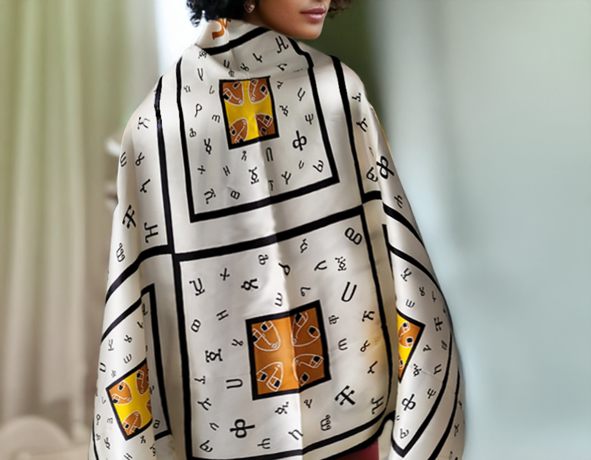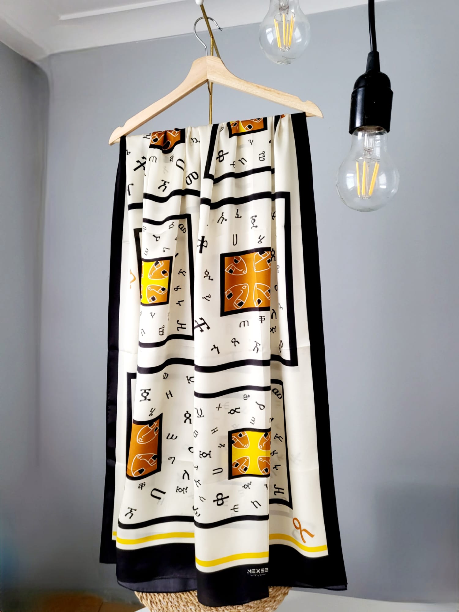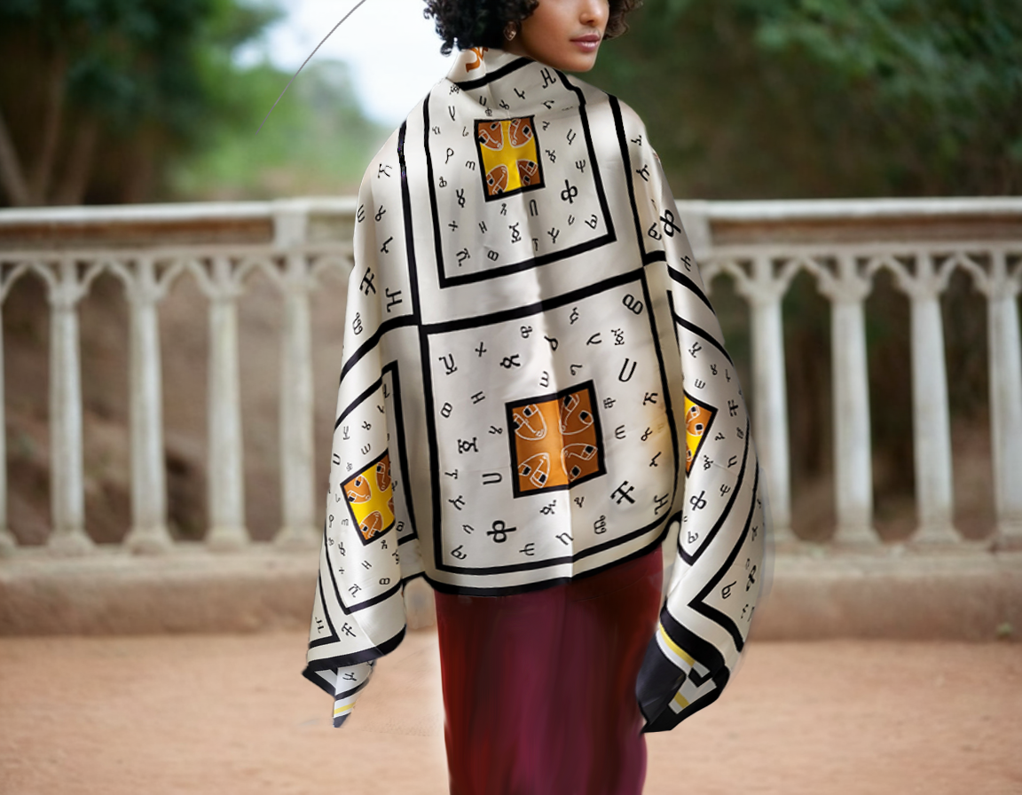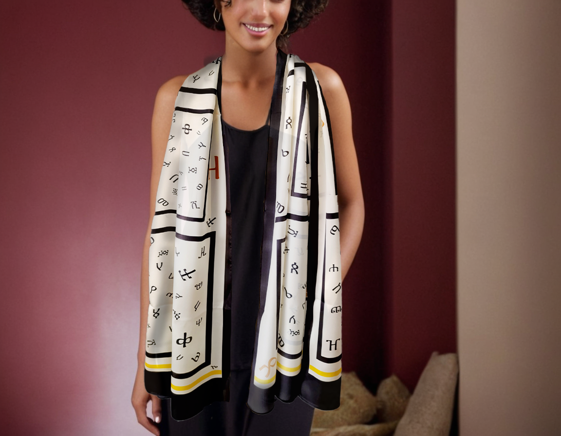 Introducing the “Ge’ez V1” scarf, a beautifully crafted pure silk satin accessory inspired by the ancient Ge’ez script. symbolizing the rich cultural heritage of Ethiopia and Eritrea. Made from 100 silk satin, the Ge’ez V1 scarf effortlessly adds a touch of elegance and cultural depth to your wardrobe, ideal for both casual and formal occasions.