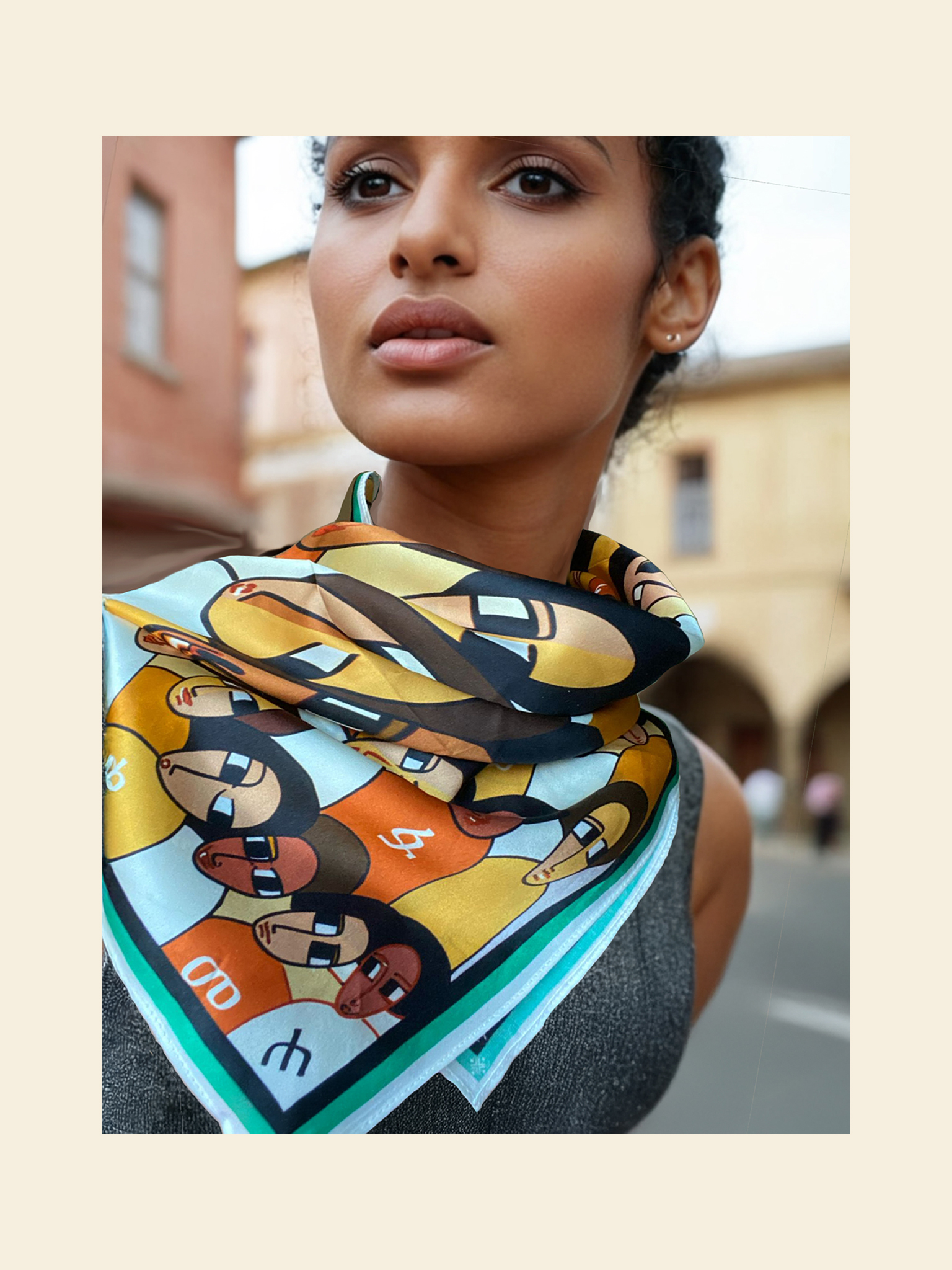 “Selam,” meaning peace, the design encapsulates the essence of a community in harmony. The square shaped large eyed faces with sprinkle of African alphabets are the hallmark of the designer’s collection. Measuring 66 x 66 centimetres, the scarf boasts a glossy, lightweight finish that enhances its luxurious appeal. A perfect accessory to elevate any outfit from day to evening occasions.